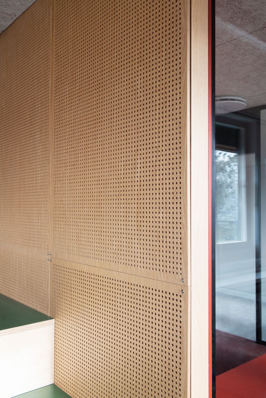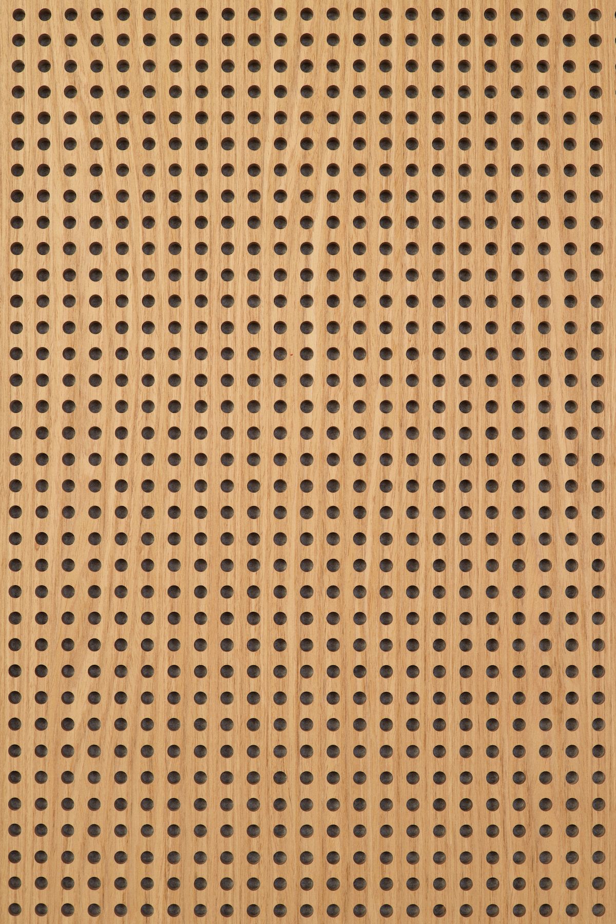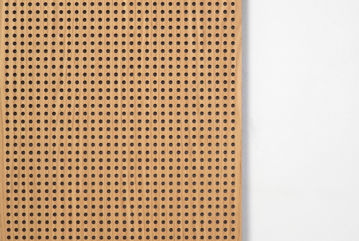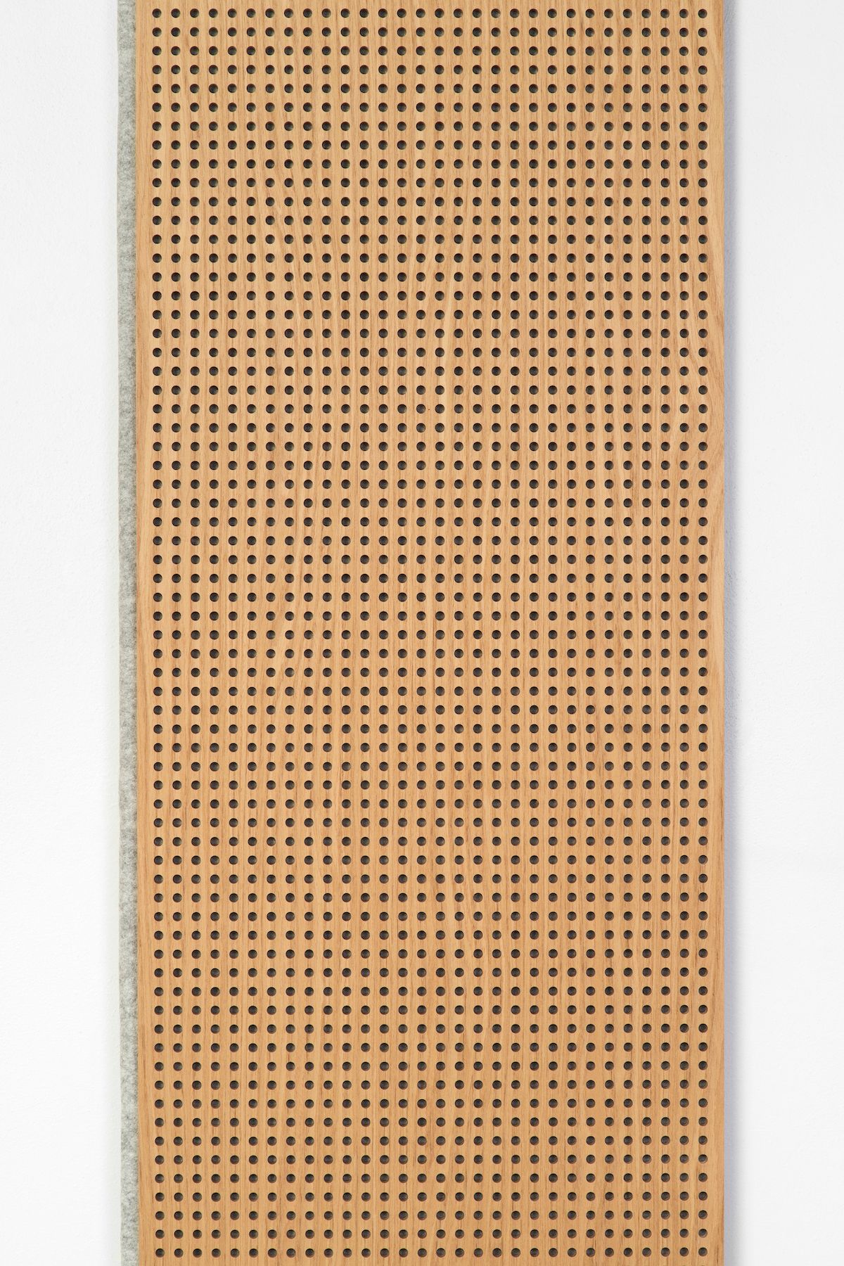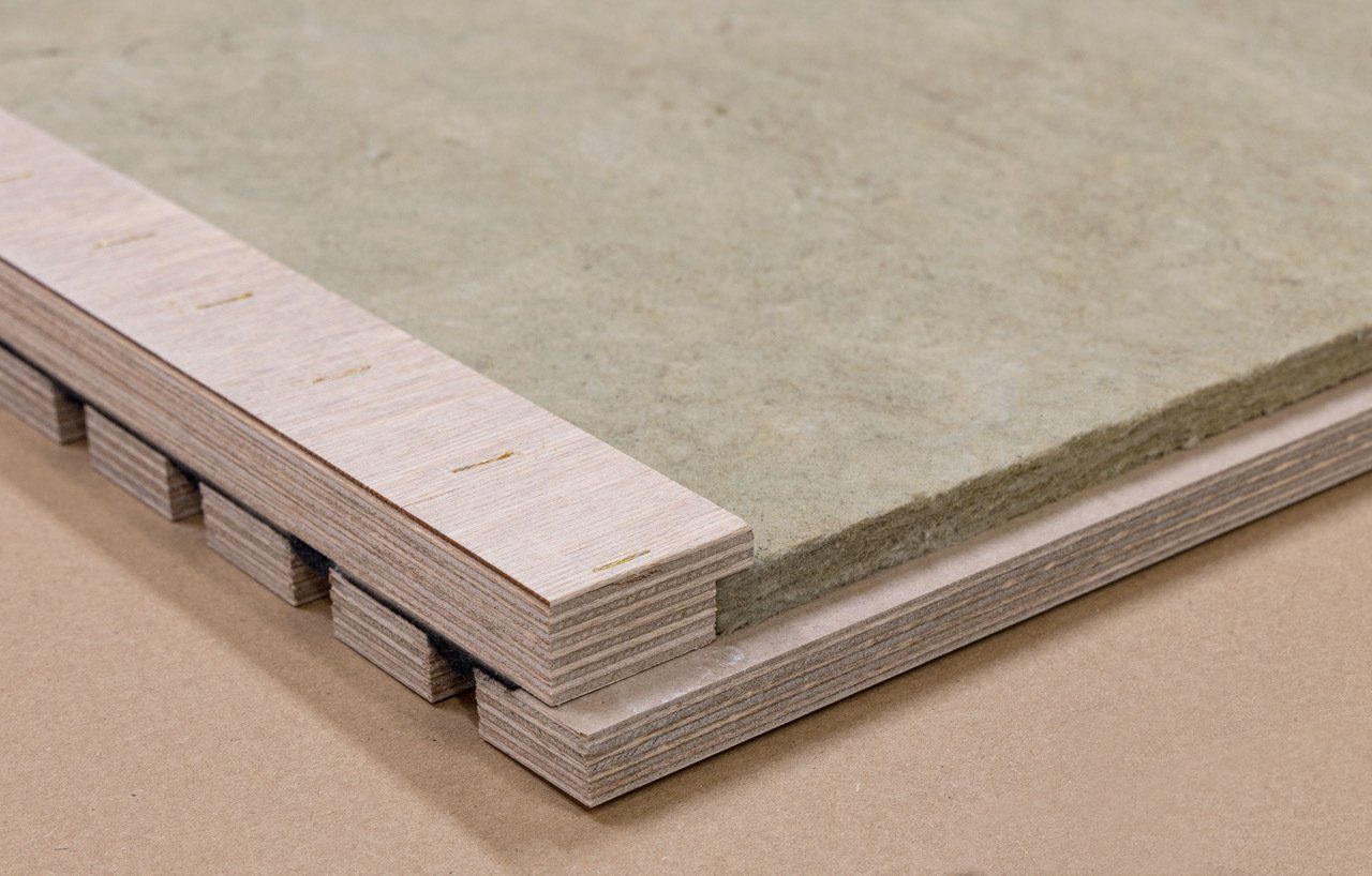 Feuerimprägnierte Lamelle aus Birkensperrholz mit Furnier auf der Vorderseite, Akustikstoff, Mineralwolle und Montagestreifen in einer Platte vereint.
