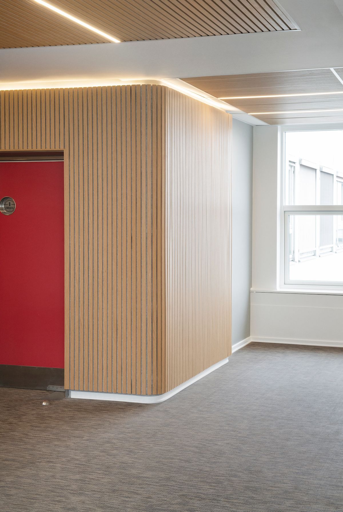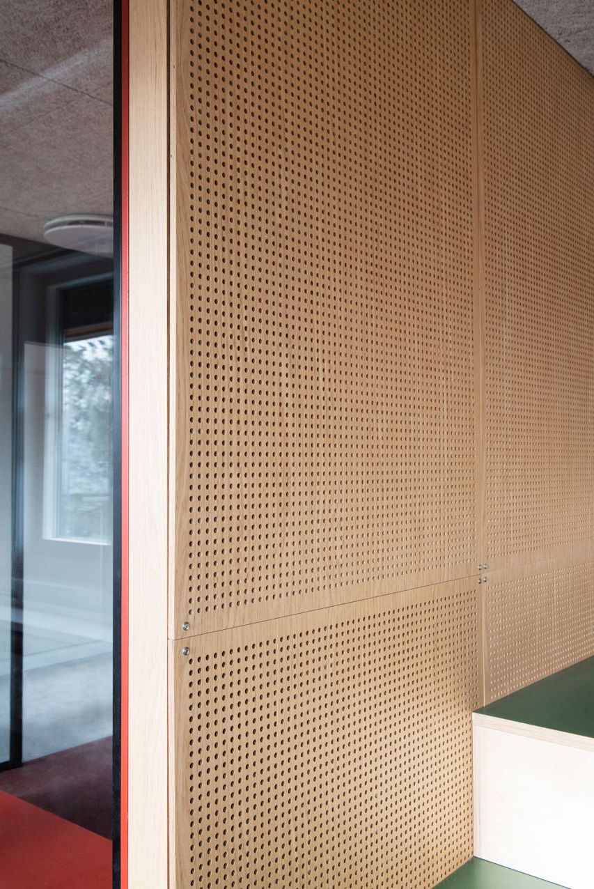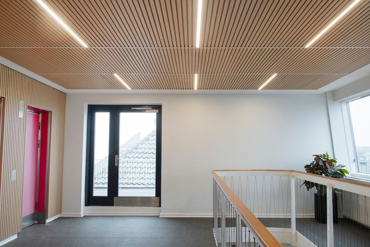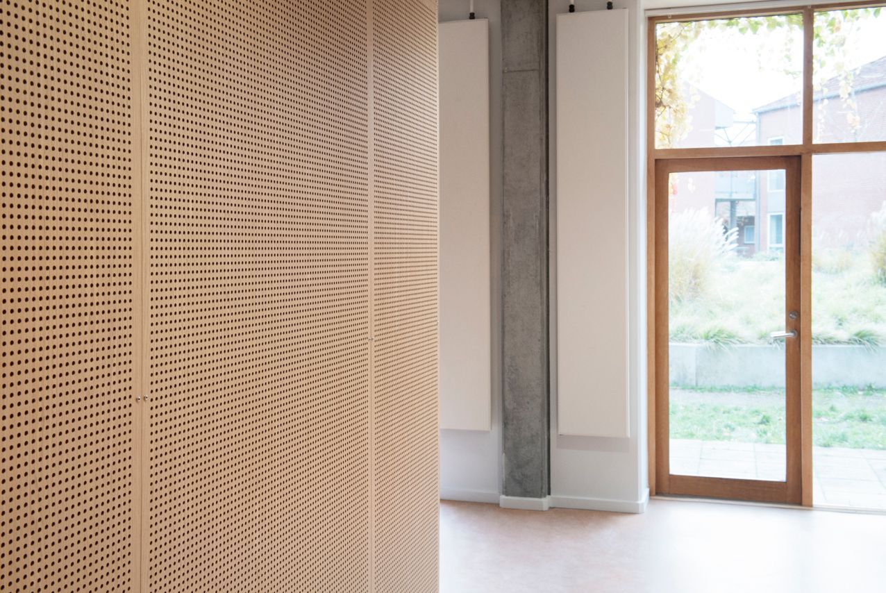 Feuerimprägnierte Lamelle aus Birkensperrholz mit Furnier auf der Vorderseite, Akustikstoff, Mineralwolle und Montagestreifen in einer Platte vereint.