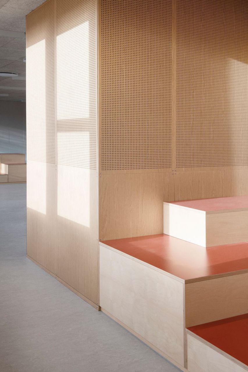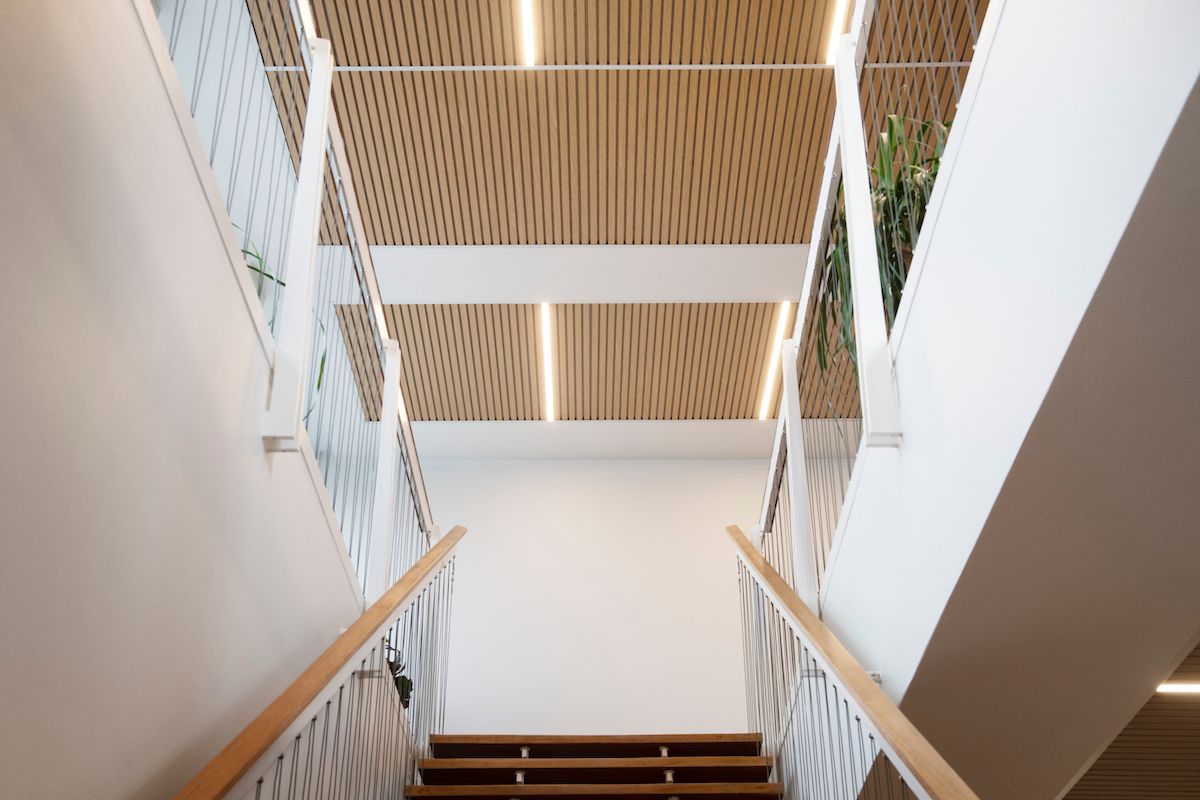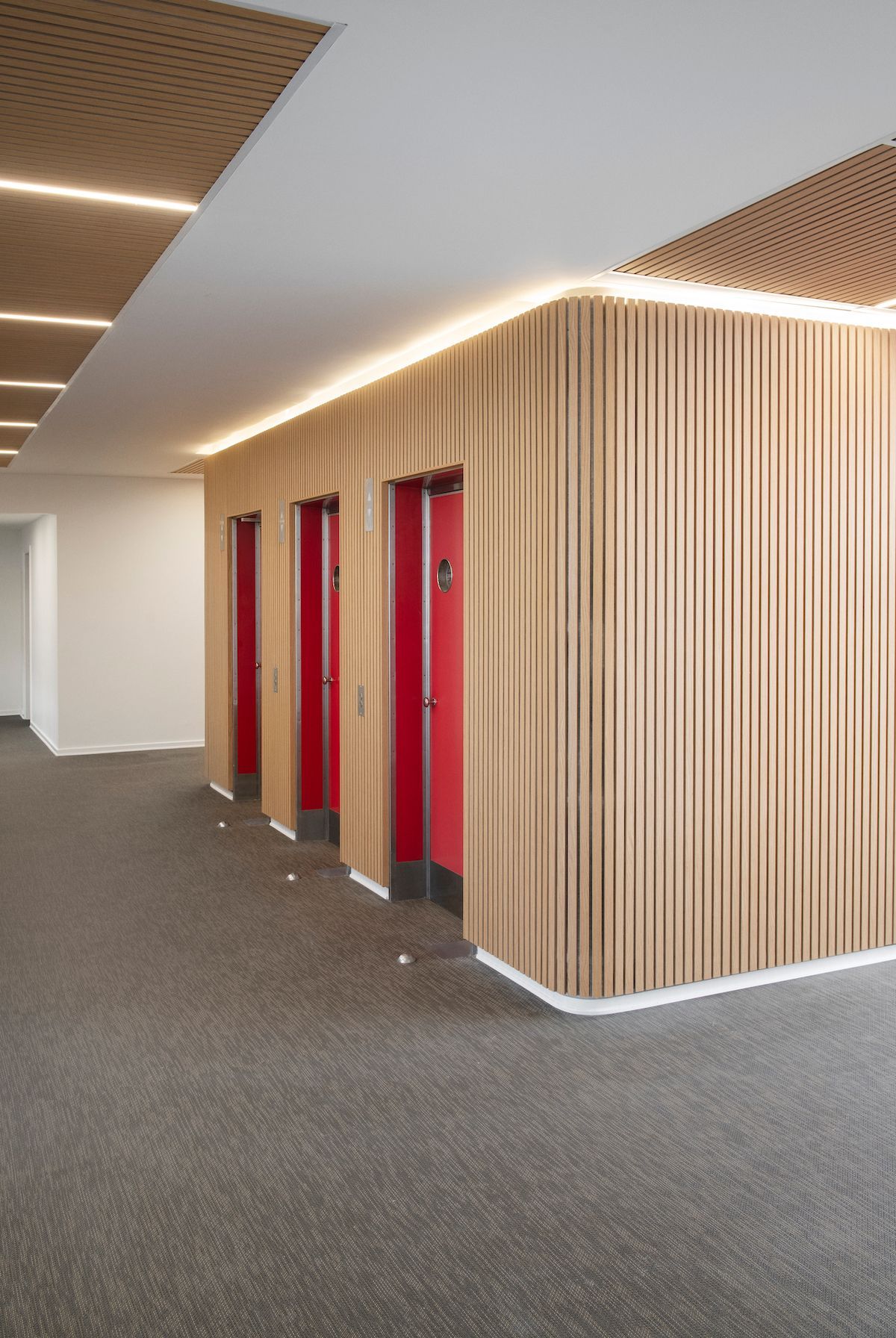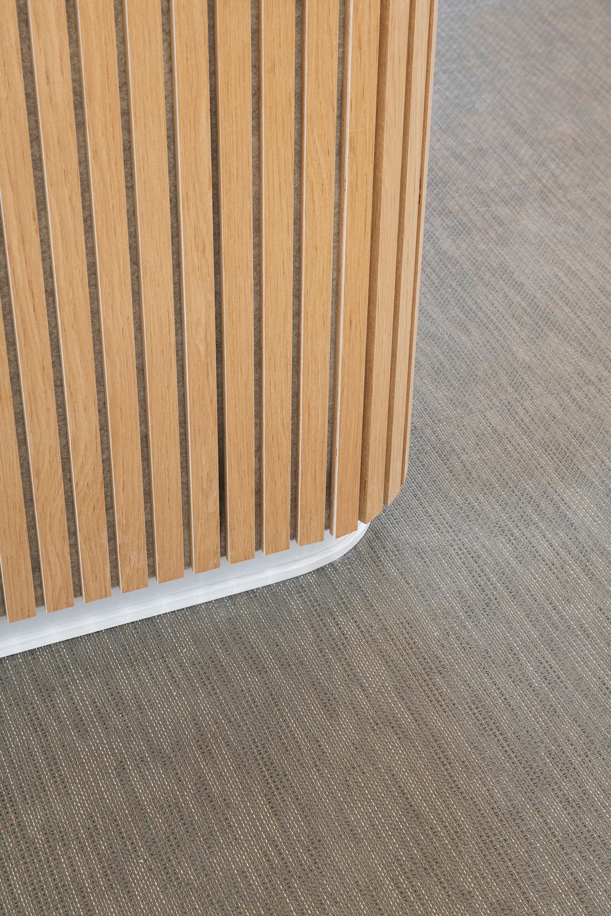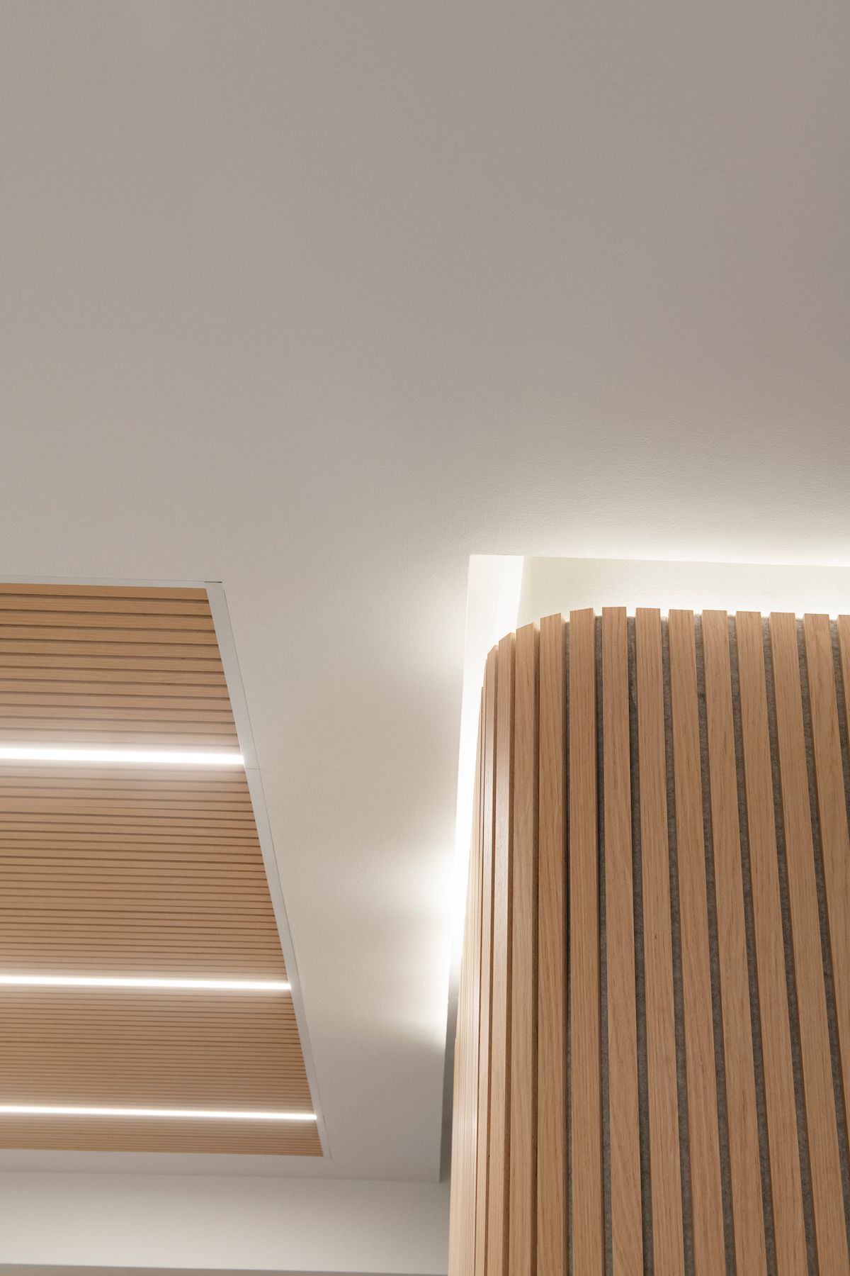 Feuerimprägnierte Lamelle aus Birkensperrholz mit Furnier auf der Vorderseite, Akustikstoff, Mineralwolle und Montagestreifen in einer Platte vereint.