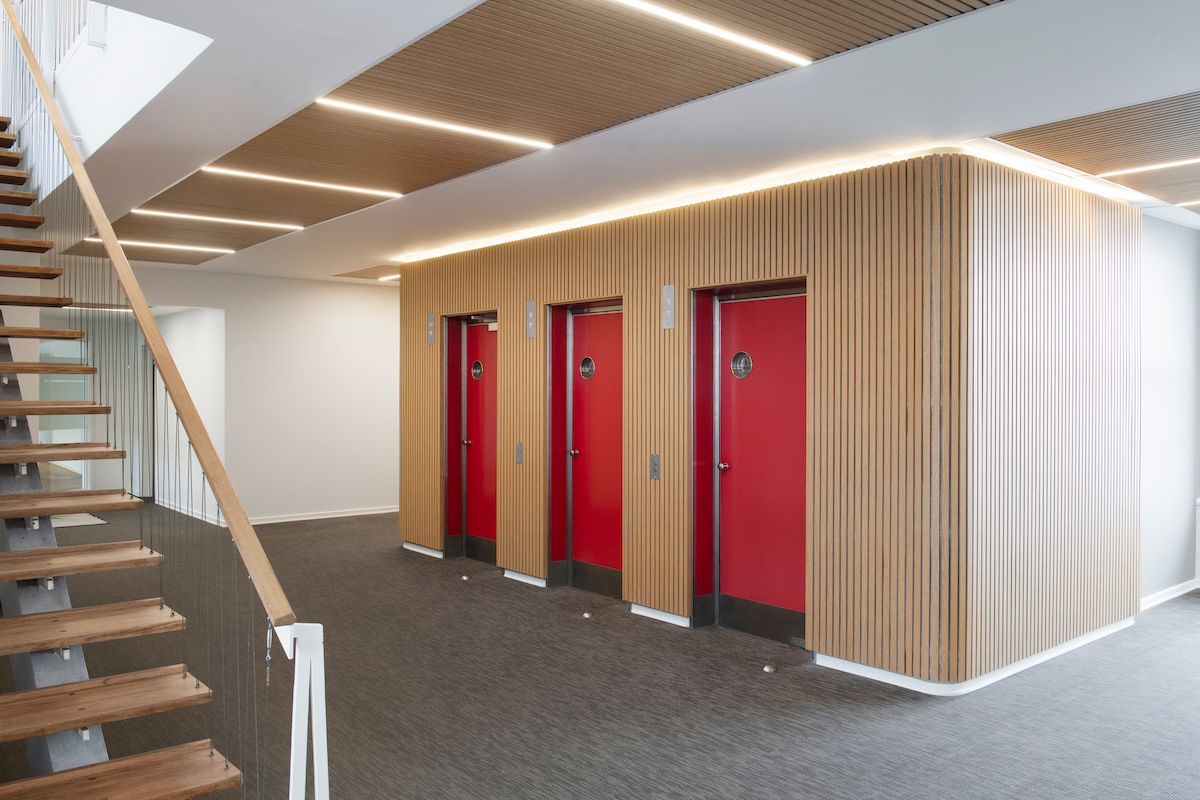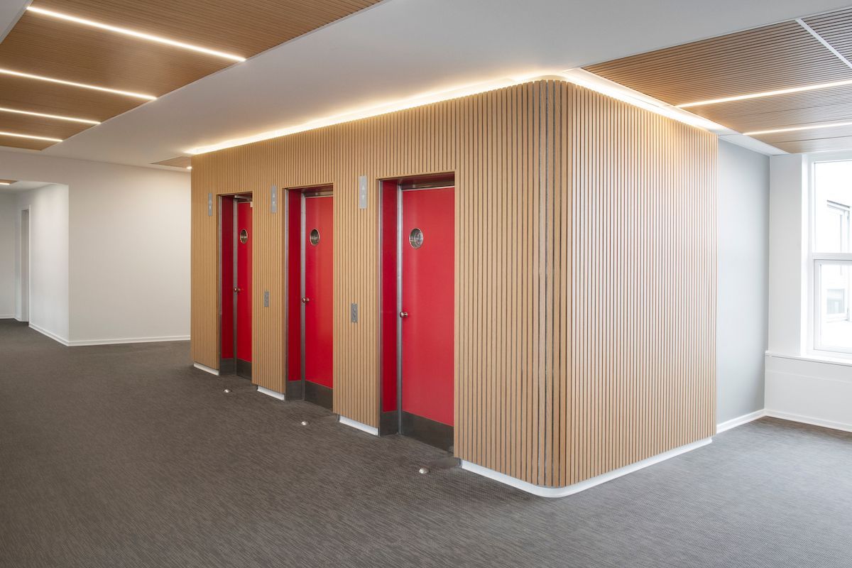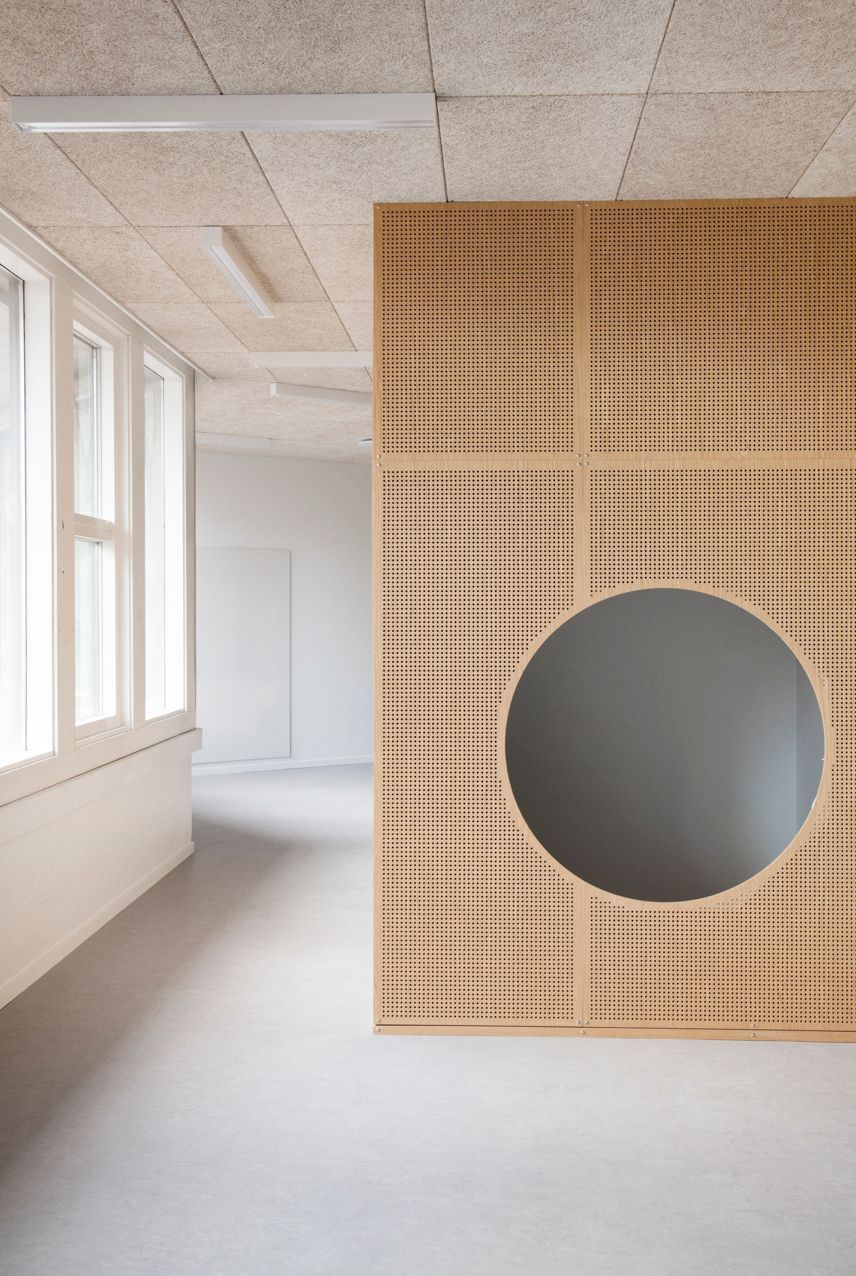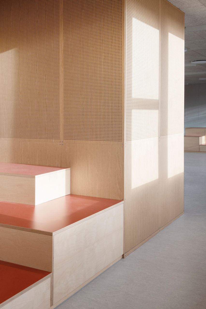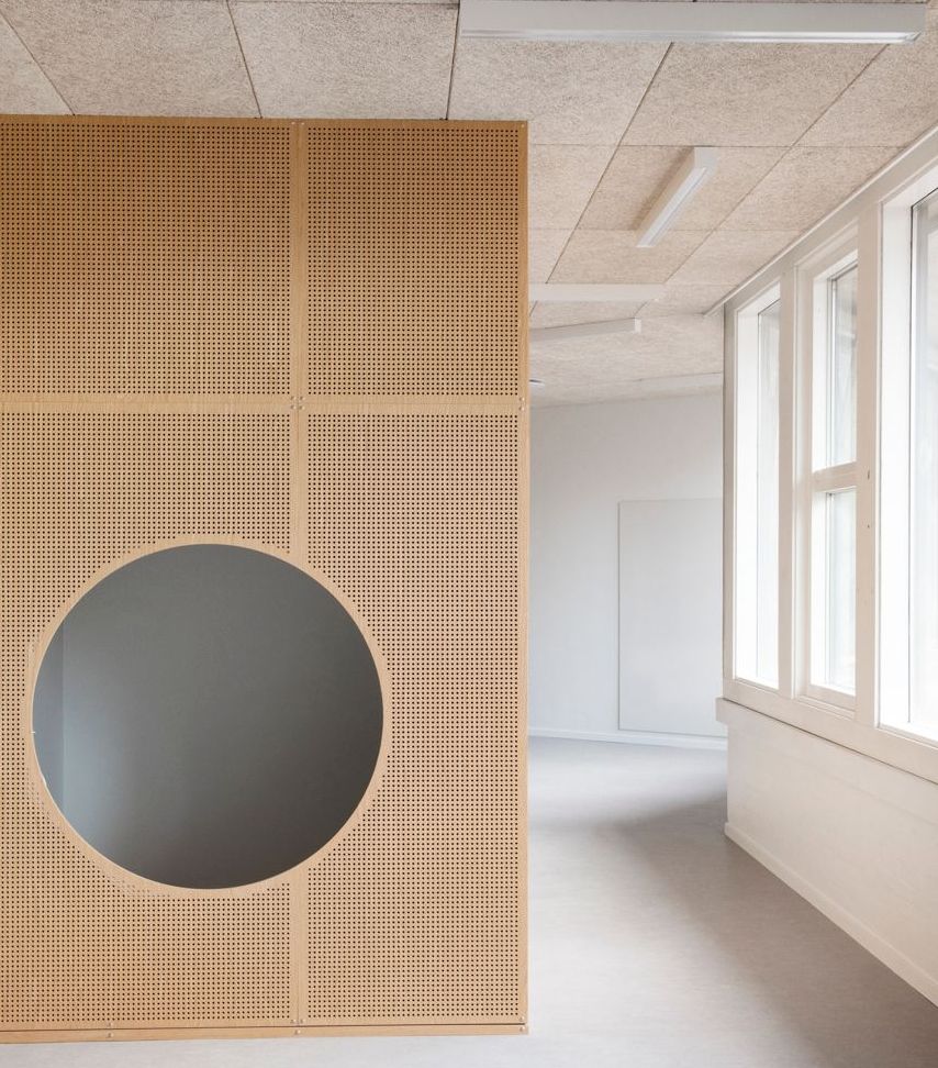 Feuerimprägnierte Lamelle aus Birkensperrholz mit Furnier auf der Vorderseite, Akustikstoff, Mineralwolle und Montagestreifen in einer Platte vereint.